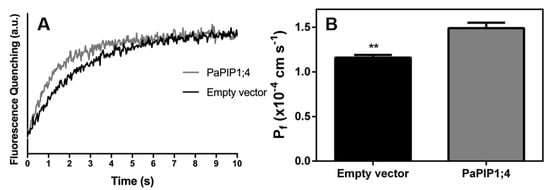 Water permeability of yeast cells transformed with pVV214-empty (control) or pVV214-PaPIP1;4 determined by stopped-flow fluorescence. (A) Fluorescence quenching of yeast cells subjected to a hyperosmotic shock and subsequent cell shrinkage; (B) Osmotic permeability coefficient (Pf) of control and PaPIP1;4 transformed cells. Values are the mean ± SD and asterisks indicate statistical significance (** p ≤ 0.01).