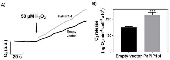 H2O2 transport by yeast cells transformed with pVV214-empty or pVV214-PaPIP1;4 (grey). (A) Typical O2 release (after intracellular breakdown of H2O2) signal recorded by the Clark electrode in response to 50 µM H2O2. (B) Rates of O2 release after the addition of 50 µM H2O2. Values are the mean ± SD and asterisks indicate statistical significance (*** p ≤ 0.001).