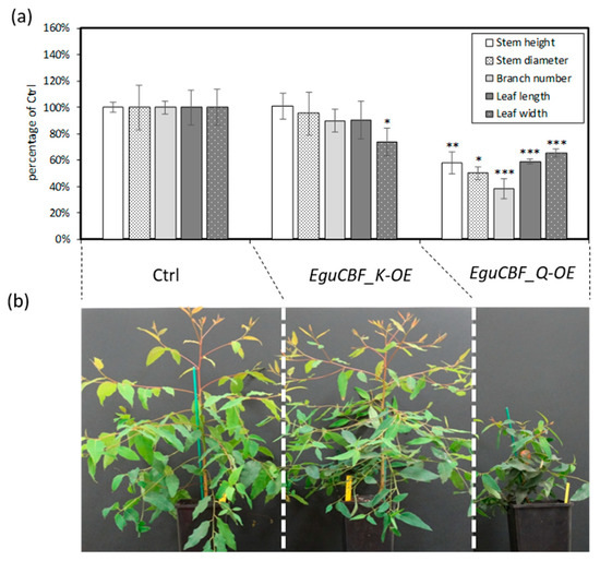 Comparison of morphological parameters between CBF-OE and control lines. (a) Morphological traits (stem height, stem diameter, branch number, leaf length, and width) were measured on 6-month-old CBF-OE (EguCBF_K-OE, EguCBF_Q-OE) and control plants (Ctrl). The results are means ± SD of six biological replicates. Statistical difference with control was assessed using Tukey HSD test: *** (p < 0.001), ** (p < 0.01), and * (p < 0.05). (b) General shape and size of 6-month-old plants.