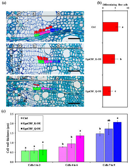 The impact of ectopic overexpression of CBF on secondary growth was further investigated on stem transversal sections by counting the number of differentiating xylem cells (i.e., xylem cells situated between flat and dividing cambial initials, and xylem cells that initiated secondary cell wall deposition) as a proxy for evaluating cambial activity. The number of differentiating xylem cell layers that exhibited thin primary cell walls (red cells in Figure 3a) was significantly reduced in both EguCBF_K-OE and EguCBF_Q-OE plants, by 21% and 48%, respectively, as compared to control plants (Figure 3b). We also used cell wall thickness as a proxy for evaluating the xylem cells’ maturation state. For this purpose, we artificially designed three groups of xylem cell layers: 1 to 3 (Figure 3a green), 4 to 6 (Figure 3a pink), and 7 to 9 (Figure 3a blue) adjacent to the cambial initials and measured the average cell wall thickness (Figure 3c). The first three layers 1 to 3 did not exhibit any significant difference between lines as these cells were thin, wall differentiating cells in all lines. In EguCBF_Q-OE plants, xylem cells within group 4 to 6 and group 7 to 9 exhibited significantly thicker cell walls than control plants by factors of 1.7 and 1.4, respectively. Although nonsignificant, EguCBF_K-OE plants also showed thicker cell walls than controls in these two most inner groups of cells, thus exhibiting an intermediate pattern between controls and EguCBF_Q-OE plants. These observations suggest that for both EguCBF_K-OE and EguCBF_Q-OE, secondary cell wall deposition was initiated earlier than in control plants. This focus on developing xylem from the cambial zone highlighted the significant impact of CBF overexpression on cell differentiation and on the dynamics of cell wall deposition.