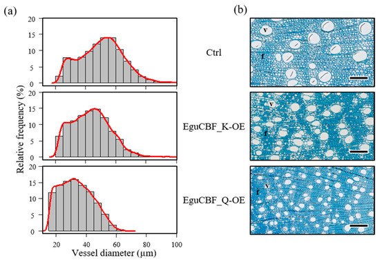 We then analyzed the xylem vessels’ properties such as diameter, density, porosity, hydraulic mean diameter, hydraulic conductivity, and vulnerability index. As shown in Figure 4, the distribution of the vessel diameter greatly differed between EguCBF_Q-OE plants and controls whereas EguCBF_K-OE showed an intermediate pattern. Most of the vessels in EguCBF_Q-OE were smaller (71.5% of them showed a maximum diameter of 40 μm), as compared to controls for which 75% of the vessels had a diameter greater than 40 μm. Notably, the smallest vessel diameter class (< 20 μm) was represented only in EguCBF_Q-OE, whereas the largest classes (60–80 µm) were virtually absent from EguCBF_Q-OE. Concomitant to the reduction of the mean vessel diameter in both EguCBF_Q-OE (−34%) and to a lesser extent EguCBF_K-OE (−15%; Table 1), the vessel density increased dramatically (+152%) in EguCBF_Q-OE and moderately in EguCBF_K-OE (+54%). Despite the reduction of their average vessel diameter, secondary xylem of both EguCBF_K-OE and EguCBF_Q-OE showed an increased porosity, statistically different from controls only for EguCBF_K-OE. We then calculated the average vessel hydraulic mean diameter that reflects the class of diameter having the highest contribution to water transport [26]. A similar trend as for the average vessel diameter was observed, where the vessels having the highest contribution to water transport in EguCBF_K-OE and EguCBF_Q-OE were 14% and 34% smaller, respectively, than in control plants. From these anatomical measurements, we extrapolated the theoretical area-specific hydraulic conductivity known to reflect the efficiency of sap flow through the vascular system [27,28]. It was severely reduced for EguCBF_Q-OE (−51%) and less so (−17%) for EguCBF_K-OE in comparison to controls. Consequently, the xylem potential vulnerability index was dramatically reduced for both CBF-OE lines (−73% and −44% for EguCBF_Q-OE and EguCBF_K-OE, respectively) as compared to controls, suggesting a lower vulnerability to hydraulic failure for these CBF-OE lines [29].