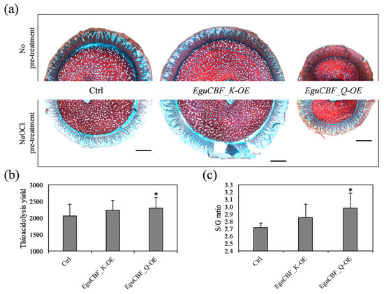 To further characterize the modifications occurring in secondary xylem, we analyzed lignin content and structure using thioacidolysis [30], a method that allows quantification of the amount and the composition of the non-condensed β-O-4 linked lignin polymer. As shown in Figure 6, the β-O-4 lignin content in stems of EguCBF_Q-OE plants was significantly increased by 11.8% as compared to controls, whereas EguCBF_K-OE showed a nonsignificant increase by 8.6% (Figure 6b). Besides these increases, significant changes were observed in the relative proportion of the S (Syringyl) versus G (Guaiacyl) monomers (Figure 6c). Indeed, the S/G ratio increased from 2.71 (controls) to 2.98 in line-EguCBF_Q-OE plants, reflecting either depletion in G monomers and/or enrichment in S monomers within the β-O-4 fraction of the lignin polymer. EguCBF_K-OE plants showed a nonsignificant increase of the S/G ratio.