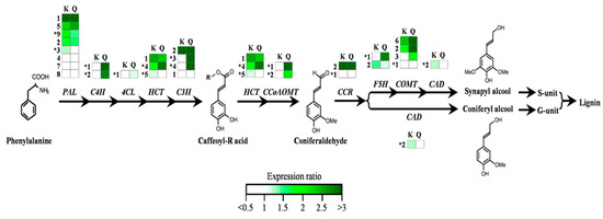 We then evaluated the impact of CBF overexpression on the relative expression of genes encoding enzymes of the different steps of the lignin biosynthesis pathway in Eucalyptus. We first analyzed the transcript levels of 15 of the 17 bona fide genes involved in lignin biosynthesis [31] in the secondary xylem of CBF-OE plants. In EguCBF_Q-OE plants, 10 of these 15 genes were more expressed than in controls with ratios ranging from 1.2 to 3.4 (p < 0.05 for 1 gene out of 3 genes tested using Student’s t-test; Figure 7; Table S1). This included genes coding for at least one isoform contributing to each of the early steps of the general phenylpropanoid pathways (EgrPAL9, EgrC4H1, EgrC4H2, EgrHCT4, EgrC3H3, EgrC3H4, EgrCCoAOMT1, EgrCCoAOMT2). Consistent with the significant increase of the S/G ratio observed, the gene EgrF5H1 involved in the biosynthesis of S monolignols was found upregulated by 2.8-fold in EguCBF_Q-OE plants, in comparison to control plants. Only 5 out of 15 bona fide genes were more expressed in EguCBF_K-OE plants than in controls with ratios ranging from 1.2 to 2.5 (p < 0.05 for 1 gene out of 3 genes tested using Student’s t-test; Table S1), mainly involved in the early steps of lignin biosynthesis (EgrPAL3, EgrPAL9, EgrHCT4, EgrC3H3) and one gene involved in the final steps of lignin biosynthesis (EgrCAD2).