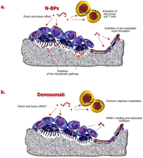 Pleiotropic effects of approved bone-targeting agents (BTAs). (a) Nitrogen-containing bisphosphonates (N-BPs) inhibit a key enzyme of the mevalonate pathway, namely the farnesyl pyrophosphate synthase, which is critical for osteoclast activity and survival. These BTAs also interfere with the formation of premetastatic niches by targeting osteoblasts and endothelial cells, as well as by inhibiting angiogenesis. Direct activities against BC cells, such as apoptosis induction and invasiveness inhibition, have been also described, along with γδ T-cell activation against tumor cells. (b) Denosumab is a fully human anti-RANK-L antibody that neutralizes the interaction of this cytokine with its receptor, RANK, expressed by osteoclasts. Thus, osteoclasts are suppressed in their maturation and activity. However, putative direct inhibitory effects of denosumab on BC carcinogenesis have been also described, together with the capability to improve the anticancer immunity.