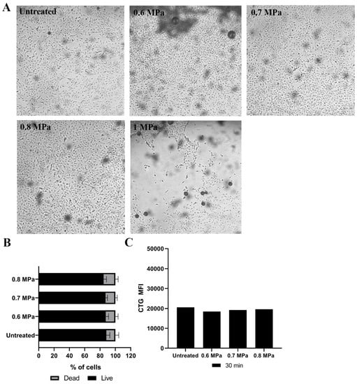 Human endothelial cells (HUVECs) stained with CellTracker™ green fluorescent dye (CTG) and treated at different ultrasound (US) acoustic pressures. Microscopy pictures of HUVECs captured before (untreated) and directly after US treatment (0.6, 0.7, 0.8 and 1 MPa) are presented at 10× magnification (A). Afterwards, cells were harvested and stained with PI to determine live and dead cells. The mean percentages of live and dead cells are presented (B). US acoustic pressures of 0.6, 0.7 and 0.8 MPa were tested to increase CTG signal intensities in HUVECs after incubation of CTG for 30 min (C). Untreated condition was HUVEs after incubation of CTG for 30 min. After 2 h of post-USMB, HUVECs were harvested and measured using flow cytometry (C). The mean fluorescent intensities (MFI) of CTG were presented (C). As a control, HUVECs without CTG staining were used. MFI results presented are the mean of two independent experiments.