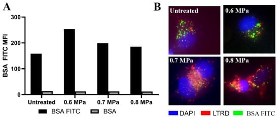HUVECs loaded with bovine serum albumin conjugated with fluorescein isothiocyanate (BSA FITC) before and after USMB application at different acoustic pressures. After administering BSA FITC with USMB, HUVECs were incubated for 1 h and then, the medium was refreshed. After 2 h, HUVECs were harvested and measured with flow cytometry to quantify the BSA FITC signal, depicted as MFI (A). The results presented were the mean of two independent experiments. These cells were also stained with a nuclear stain, DAPI (blue) and a lysosomal marker, LTRD (B). Co-localisation of red and green colours indicate the presence of BSA FITC in the lysosomal compartment (B). These images were representative images taken at 60× magnification using a fluorescence microscope (Keyence BZ9000, Mechelen, Belgium).