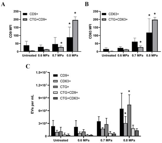 Using anti-CD9 and anti-CD63-coated magnetic beads, we captured EVs from the cell supernatants of HUVECs which have been incubated with CTG for 30 min and treated with USMB. USMB triggered an increased release of EVs from HUVEC shown by an increased level of mean fluorescent intensity (MFI) of EVs positive for CD9 and CD63 after USMB treatment especially at 0.8 MPa compared to the untreated, 0.6 and 0.7 MPa conditions (Figure 3A,B). EVs captured by anti-CD9 and anti-CD63 beads carried CTG and the MFI levels of CTG seemed to increase when US acoustic pressures were increased (Figure 3A,B). The measurement of the same cell supernatants using a micro flow cytometer showed that the concentrations of EVs exposing CD9 and CD63 increased 2- and 3-fold subsequently after USMB compared to untreated counterparts, especially at 0.7 and 0.8 MPa (Figure 3C). These EVs also carried CTG and their concentration was significantly higher at 0.8 MPa (p < 0.05, Figure 3C). The percentages of EVs positive for CD9 or CD63 which carried CTG generated by USMB at 0.8 MPa are about 20% and 37% respectively.