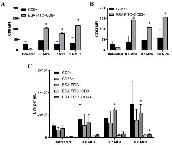 EVs-containing supernatants of HUVECs after co-administration of BSA FITC and MB followed by US treatments measured using flow cytometry. Anti-CD9 and anti-CD63 capture assays coupled to flow cytometry measurement were used to detect CD9 and CD63 EVs present in the conditioned media of HUVEC co-administered with BSA FITC together with MB. Anti-CD9 captured EVs with CD9 on the surface, whereas anti-CD63 captured EVs with CD63 on the surface. Anti-CD9 and anti-CD63 were used as the detection antibodies (A,B). The MFI of CD9 and CD63 levels in untreated and USMB treated samples (0.6, 0.7 and 0.8 MPa) and also the BSA FITC signals in these captured CD9 EVs and CD63 were quantified (A,B). Samples were measured in triplicate and these were data from two independent experiments. The same samples were measured by the micro flow cytometer. Anti-CD9 and -CD63 were used to detect EVs bearing CD9 and CD63 antigens present in the conditioned media (C). Total EVs carrying BSA-FITC, indicated by EVs exposing CD9 and CD63, which carried BSA-FITC were quantified in the same samples (C). Results are reported in EVs per mL sample. These were data from two independent experiments. EVs with BSA were used as controls and all results presented have been corrected from these controls (A–C). Statistical analysis was performed using one-way ANOVA followed by Tukey’s test. The p value < 0.05 was considered significant (*).