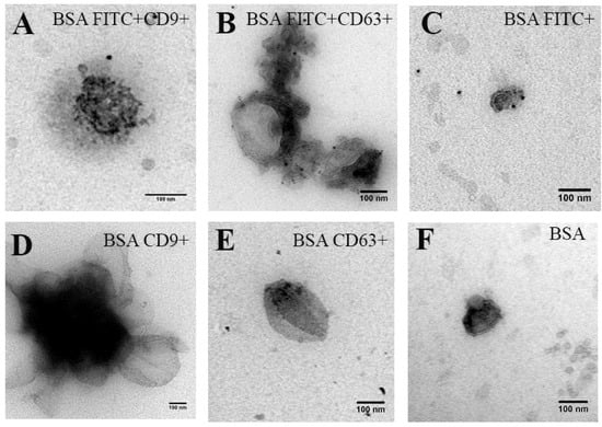 Immunogold electron microscopy of cell supernatant containing EVs derived from HUVEC treated with USMB (0.7 MPa) in the presence of BSA FITC as a model drug. EVs were stained with anti-CD9 or anti-CD63 and the detection antibody was anti mouse IgG secondary antibody labelled with 6-nm gold particles (A,B). IgG1 isotype control was used as a control for anti-CD9 and anti-CD63 staining (C). Anti FITC secondary antibody labelled with 10-nm gold particles stained BSA FITC present on EVS (A–C). As controls, cell supernatant containing EVs with non-conjugated BSA processed and stained in the same manner (D–F).