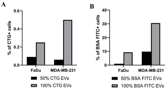 Uptake of EVs containing CTG or BSA-FITC by FaDu and MDA-MB-231 cells. EVs containing CTG (A) or BSA-FITC (B) at a concentration of 50% and 100% were co-cultured with FaDu or MDA-MB-231 cells for 4 h. The uptake of these EVs was measured by using flow cytometry. Percentages of FaDu and MDA-MB-231 cells exposing CTG or BSA FITC after EV uptake at 4 h-time point are presented (A,B accordingly). Control conditions were cells co-cultured with EVs which contained no CTG or BSA FITC. Percentages of the positive cells have been corrected for their controls and the uptake of EVs was normalized to 1 × 109 particles/mL.