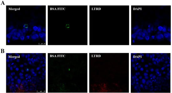We also stained the cells with the lysosomal tracker, LTRD, and nucleic acid stain DAPI, to localize the presence of EVs containing BSA FITC in the cells. Using fluorescent and confocal microscopes, we observed that EVs containing BSA FITC were taken up by cells and they were not present in the lysosomal compartment of these cells (Figure 7A,B). The FITC fluorescent signal was observed in the cell cytoplasm or in the vicinity of the cell nucleus (Figure 7A,B accordingly, and Supplementary Video S1).