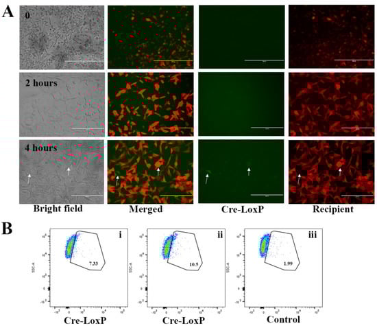 To confirm the uptake of EVs by recipient tumour cells and the release of their cargo in these cells, we co-cultured EVs containing Cre recombinase with T47D receptor cells. The expression of Cre recombinase in EVs has been confirmed by PCR (Figure S4). The colour switch from red to green when receptor cells took up EVs containing Cre recombinase was monitored using a fluorescence microscope and flow cytometer (Figure 8A,B). Using a fluorescent microscope, we monitored the uptake of EVs containing Cre recombinase (100% concentration) at 0, 2 and 4 h (Figure 8A). At 2 h, we could not detect the green Cre-LoxP cells. At 4 h, we located green Cre-LoxP cells (2 cells/0.7 cm2 chamber slide, Figure 8A white arrow). Flow cytometry analysis also shows that Cre-LoxP cells were present after co-culturing T47D recipient cells with EVs containing Cre recombinase at a concentration of 50% and 100% (Figure 8Bi,ii). Cells co-cultured with EVs without Cre recombinase served as control (Figure 8Biii). The percentage of green Cre-LoxP cells increased with increasing concentration of EV containing Cre recombinase (7.33% to 10.5%; Figure 8Bi–ii). A red-to-green colour switch observed in reporter-expressing T47D human mammary cells after co-culturing USMB-generated EV carrying active cre recombines confirms the uptake of EVs and transfer of their active cargo into the recipient cells.
