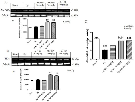 SP reduce O2− induced oxidative stress in rat paws following O2− intraplantar injection. Western blot analysis of hind paw tissues revealed a basal expression of MnSOD (A,A1) and HO-1 (B,B1) levels in the O2− group, whereas oral treatment with 30 mg/kg SP significantly increased levels more than SP 100 mg/kg. GSH/GSGG ratio was measured on hind paw tissues. SP treatment (30 mg/kg and 100 mg/kg) significantly reduce the GSH/GSGG ratio (C) aaa p < 0.001 vs. sham; bb p < 0.01 vs. O2−; bbb p < 0.001 vs. O2−.