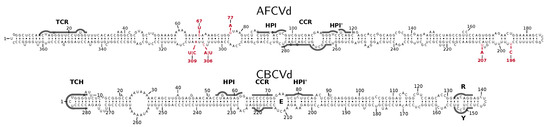 Secondary structures of analyzed viroids AFCVd and CBCVd. Sequences of AFCVd (AC AB104533) and CBCVd (AC KM211547) are shown with consensus structures predicted for alignments [35] of all available AFCVd and CBCVd sequences, respectively, optimized in ConStruct [36] at 37 °C, and drawn with R2R [37]. The central conserved region (CCR), extra-stable hairpin I (HPI), terminal conserved region (TCR), terminal conserved hairpin (TCH), loop E (E) and RY motif are marked. Variable nucleotides of AFCVd as detected in vd-sRNA (Figure S6) and by screening of cDNA libraries from germinating pollen tubes are given in red.