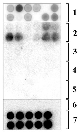 Dot-blot hybridization analysis of AFCVd-inoculated tobaccos and seedlings of F1 generation obtained by reciprocal crossings of AFCVd-infected plants and healthy controls. The dot blot was performed using oligoprime-labeled viroid cDNAs (see Materials and Methods for further details). Row 1, results of biolistic inoculation of N. tabacum with AFCVd RNA partly-purified from infected N. benthamiana (Table 1, row 3), eight weeks post inoculation (p. i.); row 2, AFCVd signals from N. benthamiana inoculated with raw RNA extract using Carborundum method, four weeks p. i.; row 3, 45 day old plants from seeds obtained by crossing of AFCVd-infected parental plants; row 4, 45 day old plants from seeds obtained by crossing uninfected control plants with AFCVd-infected parental plants; row 5, 45 day old plants from seeds obtained by crossing of AFCVd-infected parental plants with uninfected control plants; row 6, healthy controls; row 7, AFCVd signal in leaves of tobacco transformed with a plant vector containing infectious dimeric AFCVd driven from p35S. In rows 1–6, six samples, and in row 7, only five samples were spotted to one row.