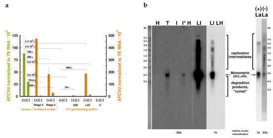 Analysis of comet composition in acrylamide gels showed a predominant fraction of shorter-than-unit-length (100–300 nucleotides) but longer than 21–24-meric viroid-derived small RNA (vd-sRNA) for sequences of both (+) and (−) viroid polarity (Figure 5a). The analyses of the viroid degradation products from pollen developmental stage 3 on denaturing acrylamide gels in discontinuous pH gradient showed that both linear and circular viroid forms were detectable (Figure 5b). The ratio of circular to linear viroid, however, was very low (0.177) for pollen samples, while for leaves this ratio reached 2.2, suggesting a high degradation rate of circular AFCVd in pollen. The quite abundant, discrete fragmentation corresponding to shorter-than-unit-length viroid detected in the pollen samples in comparison to leaf samples (Figure 5b) suggests degradation rather than intensive blocking of processing and ligation at this developmental step.