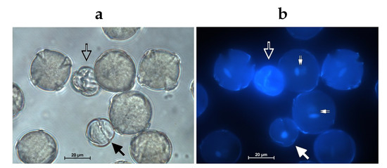 Microscopic analysis of individual pollen phenotypes evaluated in N. tabacum mature pollen grains. Aborted pollen is indicated in bright field (a) and fluorescence images after DAPI-staining (b) by empty arrows. Young bicellular pollen is indicated by filled arrows. Mature and late bicellular pollen grains with vegetative and generative nuclei visible under UV-light after fluorescence-DAPI staining are indicated on panel (b) by doubled arrows.