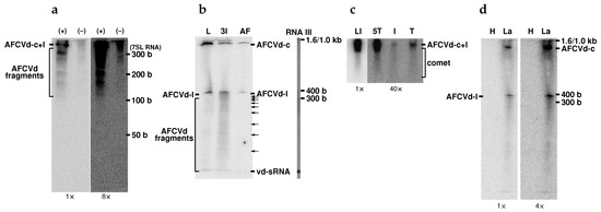 Figure 5. Northern blot analyses of shorter-than-unit-length degradation products of AFCVd in developing and germinating tobacco pollen: (a) 10 μg of 2 M-LiCl-soluble RNA isolated from AFCVd-infected pollen at developmental stage 3 was analyzed in 12% acrylamide gel containing 3 M urea and hybridized to strand-specific AFCVd RNA probes for detection of either (+) or (−) AFCVd sequences, as designated on top of the gel. (b) Analysis of 10 μg of 2 M-LiCl-soluble RNA isolated from AFCVd-infected tobacco leaves (L) and pollen from stage 3 (3I) using discontinuous-pH acrylamide gel electrophoresis. Samples were applied in 8% denaturing gel containing 8 M urea, hybridized with (−) AFCVd RNA probe for detection of (+) chains, monomeric circular (AFCVd-c) and linear (AFCVd-l) viroid. The arrows on the right indicate stronger degradation fragments of AFCVd from pollen stage 3. AF, partly purified AFCVd isolated using PEG fractionation of LiCl-soluble RNA. (c) Analysis of “comets” from tobacco infected leaves and pollen infected with AFCVd on 1.5% agarose gel; viroid-specific RNA was detected using hybridization to [32P]dCTP-labeled AFCVd cDNA. LI, 10 μg total RNA from infected leaves; 5T, I and T, 30 μg LiCl-soluble RNA from 35S:AFCVd vector-transformed pollen stage 5, infected germinating pollen and 35S:AFCVd vector-transformed germinating pollen, respectively. (d) Analysis of LiCl-soluble RNA from healthy (H) and vector pLAT52:AFCVd-transformed germinating pollen under similar gel conditions as in (b). After electrophoresis, nucleic acids in gels (a,b,d) were electroblotted to positively charged nylon membranes; a capillary blot was performed on Biodine A nylon membrane for gel (c). Positions of RNA markers are indicated on the right sides of the gels. Gel strip with RNA III marker was silver stained. As marker of 300 base RNA, position of 7SL RNA is indicated in (a). Positions of “comets” zones and cones where viroid RNA fragmentation is seen are indicated in this figure. Relative screen intensifications are given on the bottom of gels.
