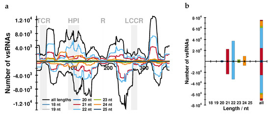 Mapping of vd-sRNA to the AFCVd genome (a) and length distribution of vd-sRNA (b) in infected leaves. (a) The x-axis represents the AFCVd genome; the curves above the x-axis (positive numbers) represent the number of vd-sRNAs with (+) sequence, below (negative numbers) with (−) sequence. The sequence regions of TCR, hairpin I, right terminal hairpin and lower CCR are marked (cf. Figure 1). Mapping of small RNAs was performed with bowtie v1.1.2 [39] allowing for one mismatch. For comparison to data from pollen stages 3 and 5 and pollen tubes, see Figure S5.