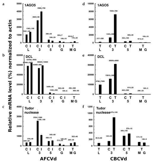 Relative mRNA levels of factors that could participate in viroid degradation in pollen: NtAGO5 (a,d), NtDCL (b,e) and NtTudor S-like nuclease (c,f). Result of qPCR performed as described in Materials and Methods were normalized to actin. Left: samples from AFCVd-infected or transformed plants; C and I, healthy control and infected sample, respectively; T, pLAT58:AFCVd-transformed/infected samples; L, young leaves; 3 and 5, pollen at developmental stages 3 and 5, respectively; G, germinating pollen (pollen tubes); M, mature pollen. Right: samples of 35S:CBCVd-transformed/infected plants; C and T, Lat52-transformed control and CBCVd-transformed/infected samples, respectively; L, young leaves; 3 and 5, pollen at developmental stage 3 and 5, respectively; M and G, mature CBCVd-transformed pollen and CBCVd-transformed pollen tubes, respectively.