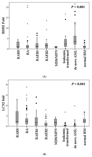 The expression of BDH2mRNA was significantly elevated in MDS patients, especially those who were high risk (RAEB-1and RAEB-2), compared to patients with normal bone marrow (BM) (P = 0.009). Further, the expression of BDH2mRNA was higher in de novo AML patients than in MDS patients (p < 0.001; Figure 1A). Conversely, LCN2mRNA expression was significantly lower in MDS patients compared with the normal population, and it reduced further with an increase in blast cells. LCN2mRNA expression levels were significantly lower in de novo AML BM samples than in those of MDS patients and the normal population (p < 0.001; Figure 1B). It was also noted that LCN2mRNA expression was higher in patients with low BDH2 expression (P = 0.015; Figure S1). However, no significant correlation was observed between BDH2 and LCN2 mRNA expression levels in the BM of MDS patients (P = 0.816; Figure S2). According to the IPSS-R prognostic scores, BDH2mRNA expression levels were higher in high- and very high-risk MDS patients than in low-risk patients (Table 1).