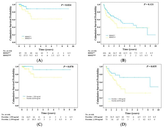 Patients in the BDH2High group showed a higher risk (15%) for leukemia progression during a long-term follow-up period than patients in the BDH2Low group (3.81%) (P = 0.017; Table 1). Further, patients in the BDH2Low group had a longer LFS than those in the BDH2High group, with medium LFS of 9 and 7 years, respectively (P = 0.024; Figure 2A), but they did not have a longer OS (P = 0.121; Figure 2B). It is noteworthy that the leukemia transformation rate is related to subtypes of MDS (refractory anemia with ringed sideroblasts (RARS): 0%; refractory anemia (RA): 2%; refractory anemia with excess blasts (RAEB)1: 11.11%; RAEB2: 20.51%; myelodysplastic syndrome/myeloproliferative neoplasm (MDS/MPN): 8.33%; P = 0.002). We found that the leukemia transformation rate was higher in the BDH2High group in each subtype, except for RARS and MDS/MPN patients (BDH2High vs. BDH2Low group: 0 vs. 0 in RARS; 6.25% vs. 0 in RA; 25% vs. 0 in RAEB1; 20% vs. 21.05% in RAEB2; 0 vs. 9.09% in MDS/MPN).Greenberg et al. defined the ferritin level as a survival predictor with a cut-off value of 350 ng/mL [30]. Patients with serum ferritin <350 ng/mL had a trend toward having a longer LFS and significantly improved OS, with medium OS of 8.8 years and LFS of 2.6 years, respectively (Figure 2C,D).