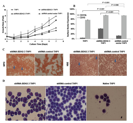 Another possible factor contributing to the growth rate might be differentiation. It has been observed that MDS patients with a lower expression level of CD11b have a lower survival rate and a higher risk of progression to AML [46]. In addition, CD15 is a marker of cell maturation, and an increase in the expression of CD15 has been reported in patients with MDS [46,47]. In this study, we noticed that there was an increase in the expression of CD11b but without a significant change in CD15 in shRNA-BDH2 THP1 cells. This suggests that a high expression of BDH2 cells is associated with a lower expression of CD11b, which is associated with a poor prognosis. Moreover, special stain studies for cell lines suggest that BDH2-KD cells have the potential to differentiate into cells with mature myeloid characteristics. Together, these results suggest that BDH2 may play a role in inhibiting differentiation.