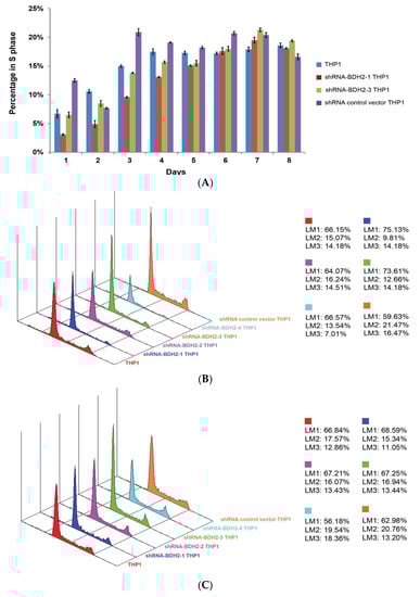 After starvation and restart of the cell cycle, we noticed that while native and shRNA control vector transfected THP1 cells started the synthesis phase and reached a plateau from day 3, shRNA-BDH2 THP1 cells started synthesis late at day 4 and continued to show increased synthesis up to day 7 (Figure 4 and Figure S7).