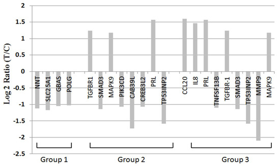 RNA microarray analysis of BDH2 targeting genes. Group 1: genes related to mitochondria; group 2: genes that have been reported as oncogenes or tumor suppressor genes; group 3: genes that function to control the survival, growth, differentiation, proliferation, and effector function of tissues and cells. All of those genes showed statistical significance with p < 0.05.