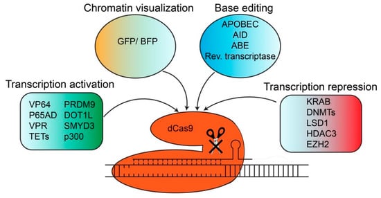 - Gilbert, L.A.; Larson, M.H.; Morsut, L.; Liu, Z.; Brar, G.A.; Torres, S.E.; Stern-Ginossar, N.; Brandman, O.; Whitehead, E.H.; Doudna, J.A.; et al. CRISPR-mediated modular RNA-guided regulation of transcription in eukaryotes. Cell 2013, 154, 442–451. [Google Scholar] [CrossRef]
