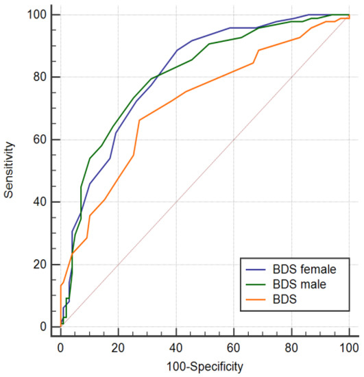 Without gender stratification, an Area Under Curve (AUC) of 0.739 was calculated. Subsequent gender-specific AUC calculation (with the BDS based on the total group) resulted in an AUC of 0.760 for men and 0.751 for women. Stratified for gender and based on gender-specific criteria in the BDS, the AUC in men (AUC = 0.806) and women (AUC = 0.807) increased, although not significantly (total group BDS vs. men BDS, p = 0.089; total group BDS vs. women BDS, p = 0.090). Receiver operator characteristic (ROC) curves of the non-stratified BDS and gender stratified groups are visualized in Figure 2.