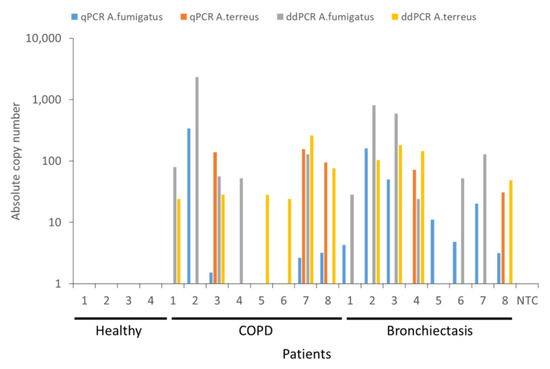Head-to-head comparison between qPCR and ddPCR for the detection of A. fumigatus and A. terreus burden in non-diseased (healthy) individuals (n = 4) and patients with COPD (n = 8) or bronchiectasis (B, n = 8). Quantification obtained from TaqMan qPCR is indicated in blue for A. fumigatus and orange for A. terreus, respectively. Quantification by ddPCR is indicated in gray for A. fumigatus) and yellow for A. terreus, respectively. NTC: no template control, Asp: Aspergillus, qPCR: quantitative polymerase chain reaction, ddPCR: droplet digital PCR, COPD: chronic obstructive pulmonary disease.