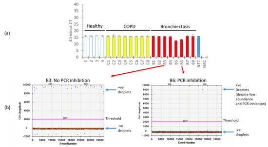 A key issue with PCR amplification using biological specimens is the presence of PCR inhibitors which, in turn, affect the quantification of the target PCR product. We next evaluated how the presence of PCR inhibitors in our respiratory specimens affects the quantification of A. fumigatus using ddPCR versus qPCR. To assess and identify PCR inhibition across our respiratory specimens, we “spiked in” an internal positive control into the mastermix followed by qPCR. Varying degrees of PCR inhibition across the respiratory specimens were noted, in particular for specimens B5 and B6, where measured absolute counts of A. fumigatus would be affected due to the detected Cqs differences translating to an almost two-fold change in expression (Figure 5a). Interestingly, however, when we examined two particular specimens: one demonstrating no PCR inhibition (B3) and the other PCR inhibition (B6), ddPCR was resistant to PCR inhibition, as long as segregation is achieved between its negative and positive fractions (Figure 5b).