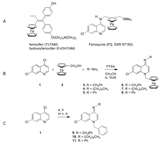 Structure and synthesis of 4-(imino)-1,4-dihydroquinoline derivatives. A. Structures of ferrocifen, hydroxyferrocifen and ferroquine; B. Synthesis of ferrocenyl 4-(imino)-1,4-dihydroquinolines 6-8. C. Synthesis of benzyl 4-(imino)-1,4-dihydroquinolines 9 and 10: (a) benzyl chloride, NaI, acetone, reflux, 12 h; (b) RNH2, EtOH, relux, 1 h. Synthesis of benzyl 4-(imino)-1,4-dihydroquinolines 11: (c) aniline, microwaves, 100 °C, 10 min; (d) benzyl chloride, microwaves, 80 °C, 40 min.