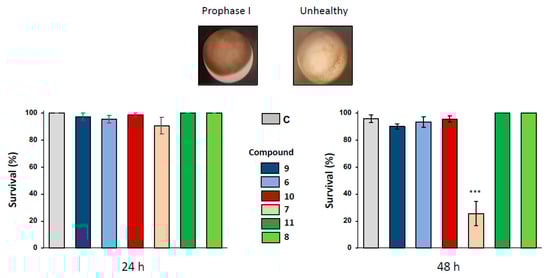 Oocyte hemi-sections were made to ascertain the presence of an asymmetrically positioned germinal vesicle in the animal hemisphere. When a longer exposure period of 48 h was used with 1,4-dihydroquinolines at the concentration of 100 µM, only compound 7 provoked a significant altered pigmentation in the oocyte animal pole and induced oocyte death with a bleaching phenotype. No modifications of oocyte integrity were observed for the other 1,4-dihydroquinolines as compared to the untreated control (Figure 2).