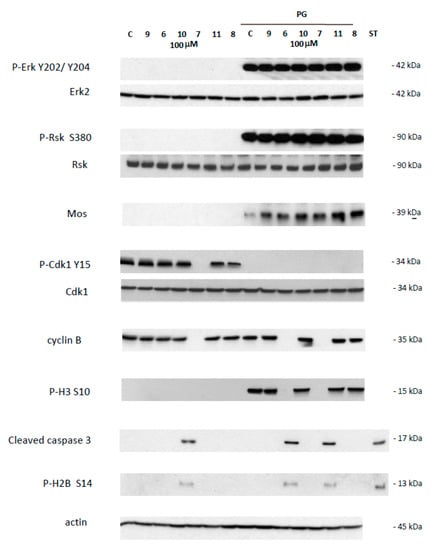 Western blot analysis of oocytes treated by 4-(imino)-1,4-dihydroquinolines. Oocytes untreated (C) or treated with progesterone (PG) were submitted to 4-(imino)-1,4-dihydroquinolines 6, 7, 8, 9, 10, 11 for 24 h. After electrophoresis, antibodies were used to reveal total and phosphorylated forms of Erk2 and P-Erk2 on Y202/Y204, Rsk and P-Rsk on S380, Cdk1 and P-Cdk1 on Y15, and phosphorylated form of P-H3 on S10, P-H2B on S14, or cleaved caspase 3, cyclin B2, Mos and actin. The membranes were revealed using an Advanced ECL chemiluminescence technology. Staurosporine 20 mM was used as apoptosis control. Erk2, Rsk, Cdk1 and actin serve as internal loading controls.