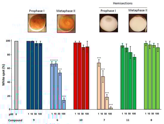 Effect of ferrocenyl 4-(alkylamino)-1,4-dihydroquinolines exposures on oocytes maturation. Oocytes were exposed overnight to increasing concentrations (1, 10, 50 & 100 µM) of each compound (9 in dark blue, 6 in light blue, 10 in red, 7 in pink, 11 in dark green and 8 in light green), in the presence of progesterone. Maturation accomplishment was assessed by the appearance of a white spot at the oocyte animal pole (metaphase II picture) and each mature oocyte was cut (hemi-sections pictures) to confirm the GVBD occurrence. Significance was assessed by ANOVA followed by a Dunnett’s test (***: p < 0,001; **: p < 0,01; * p < 0,05). N refers to the number of females and n to the number of oocytes (N = 3 and n = 60).
