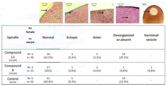 The percentage of disorganized or absent spindles in oocytes treated with compound 8 was lower (4.8%) compared to compound 11 and untreated controls (23.3% and 21.1%, respectively). Asters are present in treated oocytes with a very low percentage close to 1%. Oocytes displaying a germinal vesicle are only seen under compound 11 treatment (4.8%).