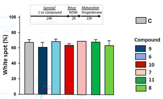 Determination of metaphase II entry in oocytes pre-exposed to ferrocenyl 4-(alkylamino)-1,4-dihydroquinolines. After incubation or not with compounds 9, 6, 10, 7, 11, 8 for 24 h, oocytes were rinsed four times in ND96 for 30 min, before progesterone stimulation. White spot appearance was scored after 15 h. N refers to the number of females and n to the number of oocytes (N = 2 and n = 60).