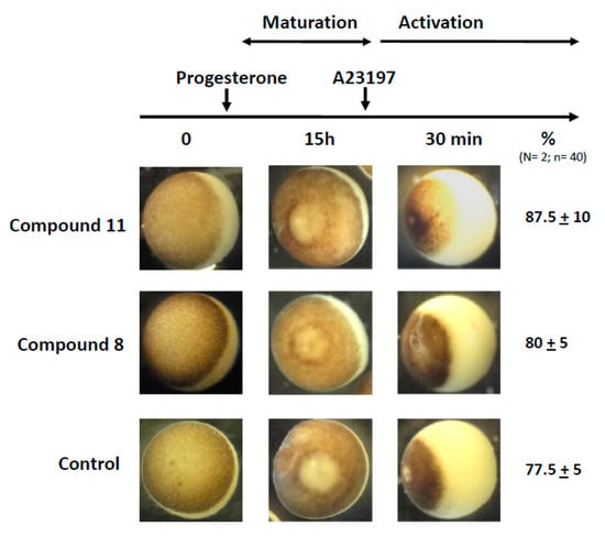 For oocyte survival and meiosis resumption experiments, oocytes were exposed for 24 or 48 h at 19 °C to 1,4-dihydroquinoline solutions (compounds 6-11) at concentrations of 1 µM, 10 µM, 50 µM or 100 µM. Phenotypically, the unhealthy and dying oocytes were detected by an unorganized rearrangement of the homogenous animal pigmentation and a general bleaching. Meiotic resumption was triggered by the addition of progesterone (4 µg·mL−1) alone or concomitantly or after 1,4-dihydroquinolines. The appearance of a white spot at the apex of the pigmented hemisphere of the oocyte indicated the ongoing meiosis process including migration and dissolution of the germinal vesicle (germinal vesicle breakdown, GVBD) and followed by the formation and the attachment of the meiotic spindle to the plasma membrane, characteristic of metaphase II arrested oocyte. In some cases, oocytes were heat fixed at 100 °C for 5 min and hemi-sections along the animal to the vegetative pole were performed to ascertain the presence of the germinal vesicle. As control, staurosporine (20 mM) was used to induce prophase I oocytes apoptosis []. For parthenogenetic activation, in vitro-matured oocytes previously treated by progesterone (4 µg·mL−1), with or without compounds 8 or 11, for 24 h, were transferred to a solution of five times water diluted ND96 containing 50 μM of A23187 calcium ionophore (Calbiochem®, Millipore Corporation, Burlington, MA). The typical cortical reaction visualized by a pigment retraction towards the animal region was monitored after 20 to 30 min.