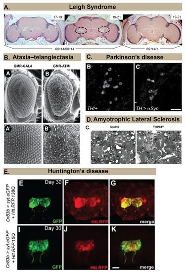 - McGurk, L.; Berson, A.; Bonini, N.M. Drosophila as an In Vivo Model for Human Neurodegenerative Disease. Genetics 2015, 201, 377–402. [Google Scholar] [CrossRef]