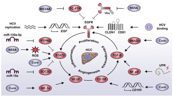 HCV infection has been reported to induce a wide range of cell signaling alterations, which directly or indirectly contribute to the development and progression of liver diseases [,]. In the following paragraphs, we illustrate this aspect by describing the relationship between HCV and four major signaling drivers that play an important role in liver disease progression towards HCC: the epidermal growth factor (EGF), signal transducer and activator of transcription 3 (STAT3), transforming growth factor beta (TGF-β) and vascular endothelial growth factor (VEGF). In its evolution, HCV diverted these pathways to promote its replication and persistence with important consequences to viral pathogenesis and liver disease (Figure 1).