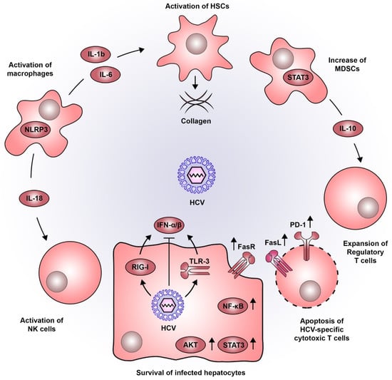 During viral infections, pathogen-associated molecular patterns (PAMPS) are recognized by innate immune sensors, i.e., toll-like receptors (TLRs), retinoic acid-inducible gene I (RIG-I), and cyclic GMP-AMP synthase (cGAS), triggering a rapid IFN type I response against infection []. As a prototype positive-stranded RNA virus, HCV is mainly recognized by the TLR3 and RIG-I, although it has developed several mechanisms to evade innate immune sensing and to blunt the resulting IFN response (reviewed in more detail in []). During chronic infection, HCV triggers TLR3 signaling also in monocytes and macrophages leading to the secretion of proinflammatory cytokines including interleukins (IL) and an activation of the inflammasome [] without IFN induction. In vitro data suggest that sensing of HCV-infected hepatocytes by macrophages triggers NLR3P inflammasomes and induces IL-18 secretion, which activates natural killer (NK) cells []. Since the host fails to overcome HCV infection, the persistent deregulation of immune factors such as IFN signaling, activation of NF-κB, TNF-α and IL-6-mediated signaling were found to be significantly associated with a poor prognosis for HCC development [] and thus, presumably contribute to liver disease progression.