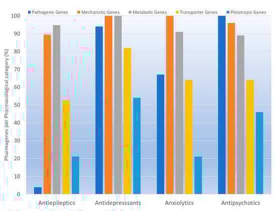According to data available in the World Guide for Drug Use and Pharmacogenomics [] and the EuroPharmaGenics (EPG) database [] concerning central nervous system (CNS) drugs (Figure 1), the best-known genes of the pharmacogenetic machinery involved in the processing of antiepileptic, antidepressant, anxiolytic, hypnotic, sedative, antiparkinsonian, and antipsychotic drugs are mechanistic and metabolic genes, and poorly investigated genes are those involved in pathogenic mechanisms, transporters, and pleiotropic genes (Figure 1). Globally, 74% pathogenic, 97% mechanistic, 94% metabolic, 68% transporter, and 40% pleiotropic genes have so far been associated with CNS drug efficacy and safety [].