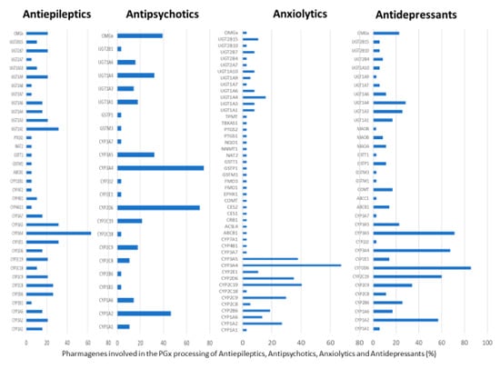 Antipsychotics (Table 3) are associated with the PGx activity of less than 100 pharmagenes. The different pharmacological categories of antipsychotics (phenothiazines with aliphatic side-chain, piperazine-related phenothiazines, piperidine phenothiazines, butyrophenones, indole derivatives, thioxanthenes, diphenylbutylpiperidines, diazepines, oxazepines, thiazepines, oxepines, benzamides, and other neuroleptics) are substrates, inhibitors, or inducers of 32, 16, and 3 enzyme/protein gene products, respectively, and are transported by at least 14 different protein transporters. CYP enzymes participate in the metabolism of 90% of antipsychotics. These drugs are major substrates of CYP3A4 (75%), CYP2D6 (72%), CYP1A2 (46%), CYP2C19 (22%), and UGT1A4 (33%); inhibitors of CYP2D6 (50%), CYP3A4 (42%), ABCB1 (29%), CYP1A2 (25%), CYP2C19 (21%), and CYP2C9 (15%); and inducers of GSTM1, MAOB, and SLCO3A1 with low affinity (<5%). About 50% of antipsychotics are transported by ABCB1. Other transporters responsible for the influx-efflux of neuroleptics are KCNH2 (22%); KCNE1 and KCNE2 (18%); KCNQ1 (18%); and SLC6A2, SLC6A4, and SCN5A (11%). Haloperidol is associated with 31 pharmagenes, Olanzapine is associated with 28, and Thioridazine is associated with 27 [,].