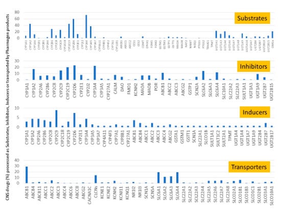 CNS drugs can act as substrates, inhibitors, or inducers of enzymes encoded by metabolic genes (Figure 2). Among the 307 most frequently used CNS drugs, antiepileptics represent 14.66%, antiparkinsonians represent 10.42%, antipsychotics represent 21.82%, anxiolytics represent 11.40%, hypnotics and sedatives represent 21.17%, antidepressants represent 20.53%, and anti-dementia drugs represent 1%–2% (Figure 1 and Table 2). About 90% of these drugs use CYP enzymes as major metabolic pathways. CNS drugs are substrates, inhibitors, or inducers of 58, 37, and 42 enzyme/protein gene products, respectively, and are transported by 40 different protein transporters (Figure 3). CNS drugs are major substrates of CYP3A4 (71%), CYP3A5 (37%), CYP2D6 (60%), CYP2C19 (45%), and CYP1A2 enzymes (44%); inhibitors of CYP3A4 (22%), CYP2D6 (23%), CYP2C19 (20%), CYP1A2 (17%), and CYP2C9 (15%); and inducers of CYP2C9 (9%), CYP2D6 (7%), CYP3A4 (5%), CYP1A2 (4.5%), CYP2A6 (4.5%), and CYP2B6 (3.7%). Major transporters of CNS drugs are ABCB1 (29%), SLCA1 (20%), SLC6A4 (20%), CLCNs (15%), SLC6A3 (12%), and SLC6A2 (11%) (Figure 3) [].