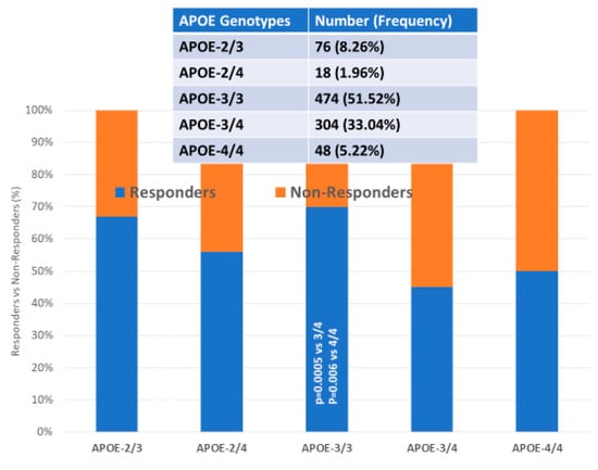APOE-related responder/nonresponder rate in patients with Alzhimer’s disease treated with a multifactorial/combination treatment for one year. Responders: Final Mini-Mental State Examination (MMSE) score > basal MMSE score. NonResponders: Final MMSE score < basal MMSE score. Data Source: Cacabelos et al., 2014.