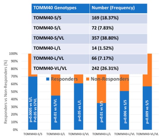 In linkage disequilibrium with and adjacent to the APOE locus (19q13.2) is the TOMM40 gene, which encodes an outer mitochondrial membrane translocase involved in the transport of Aβ and other proteins into mitochondria. A poly T repeat in an intronic polymorphism (rs10524523) (intron 6) in the TOMM40 gene has been implicated in AD pathogenesis and PGx. The number of “T”-residues in the rs10524523 (“523”) locus differentiates 3 allele groups: “short” (S, T ≤ 19), “long” (L, 20 ≤ T ≤ 29), and “very long” (VL, T ≥ 30). rs10524523 L variants are associated with a higher risk for late-onset AD (LOAD). APOE-TOMM40 interactions affect the risk of AD and the response to drugs. The S/VL and VL/VL TOMM40 poly T genotypes interact with all APOE genotypes; however, the APOE-4/4-TOMM40-L/L association is unique, accounting for 30% of APOE-4/4 carriers. TOMM40 poly T-S/S carriers are the best responders, VL/VL and S/VL carriers are intermediate responders, and L/L carriers are the worst responders to treatment. TOMM40-L/L and S/L carriers in haplotypes with APOE-4 are the worst responders to treatment. TOMM40-S/S carriers and, to a lesser extent, TOMM40-S/VL and TOMM40-VL/VL carriers in haplotypes with APOE-3 are the best responders to treatment. The TOMM40-L/L genotype is exclusively associated with the APOE-4/4 genotype in 100% of the cases, and this haplotype (4/4-L/L) might be responsible for premature neurodegeneration and consequent early onset of the disease, a faster cognitive deterioration, and a limited response to conventional treatments [,] (Figure 5).