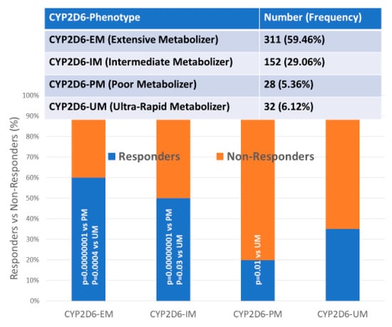 Approximately 80% of patients are deficient metabolizers for the tetrategic cluster integrated by CYP2D6, 2C19, 2C9, and 3A4/4 variants which encode enzymes responsible for the metabolism of 60–80% of drugs of current use, showing ontogenic-, age-, sex-, circadian- and ethnic-related differences. CYP geno-phenotypes differentiate extensive (EM; normal, NM), intermediate (IM), poor (PM), or ultra-rapid metabolizers (UM) with great geographic and ethnic variability worldwide [,,].