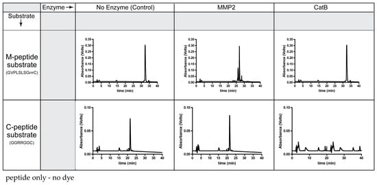 As expected, MMP2 recognized the M-peptide substrate and did not cleave the C-peptide substrate. Compared to the elution time of the original M-peptide substrate, the high-performance liquid chromatography (HPLC) chromatogram indicates cleavage of the M-peptide substrate by MMP2. Since the M-peptide substrate is not a substrate for CatB, the peptide remained intact and eluted at the original time when incubated with CatB. When incubating the MMP2 enzyme with the C-peptide substrate, the C-peptide substrate had the same elution time as the control and the uncleaved C-peptide substrate. However, the CatB enzyme recognized the C-peptide substrate, removing the original C-peptide peak from the HPLC chromatogram.